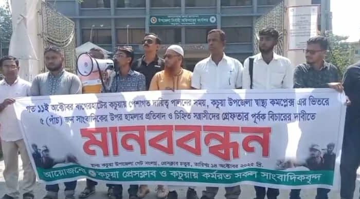 গত ১১ অক্টোবর বাগেরহাটের কচুয়া উপজেলা স্বাস্থ্য কমপ্লেক্সে সংবাদ সংগ্রহের সময় পাঁচ সাংবাদিকের ওপর সন্ত্রাসী হামলার প্রতিবাদে মানববন্ধন অনুষ্ঠিত হয়েছে।